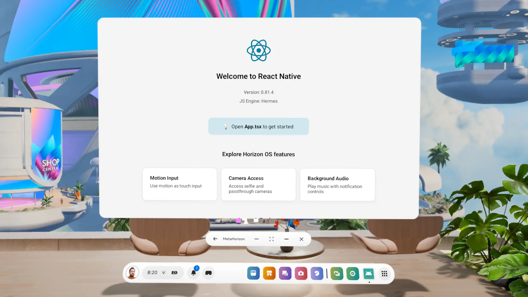 This showcase app proves React Native's viability for Meta Horizon OS development. Built in just two days, it demonstrates core capabilities and library compatibility.